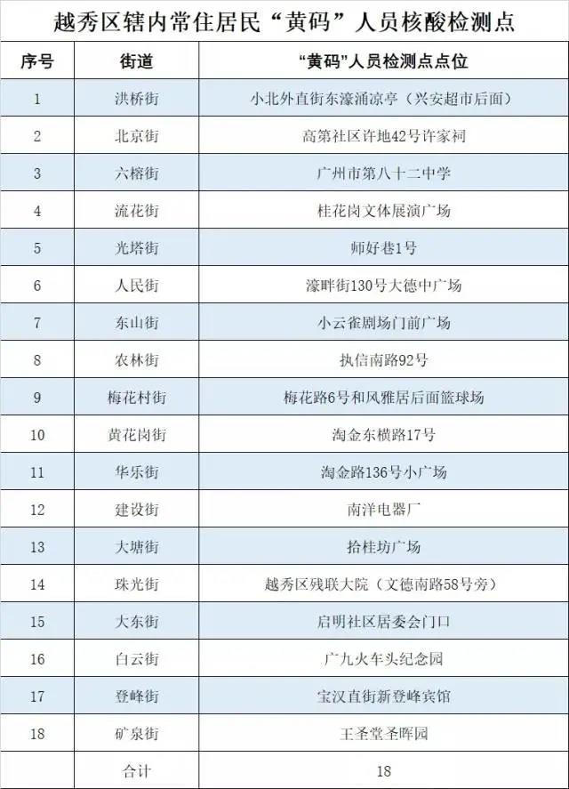 越秀區公布轄內常住居民 「黃碼」人員核酸檢測點