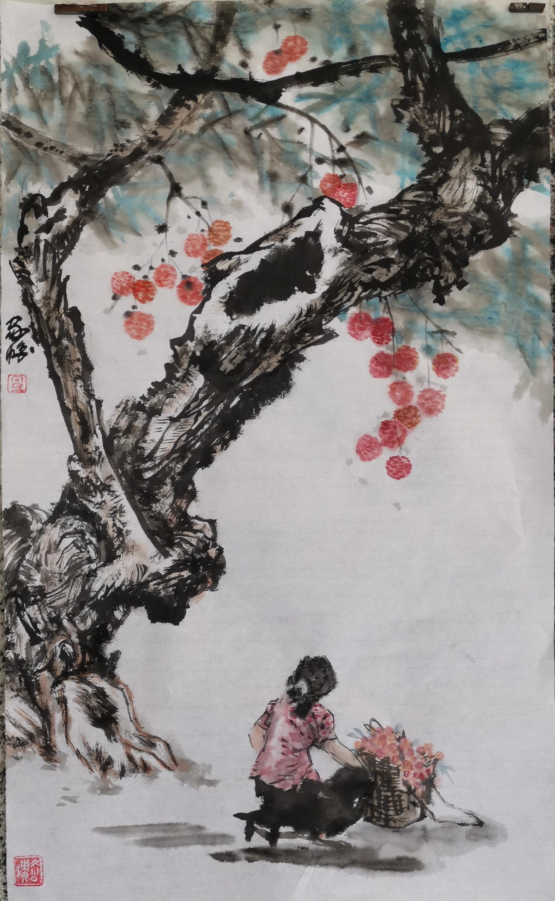 朱積的《五月》畫作,雖然呈現的是「賣荔姑娘」的背景,但全景環視之下,讓人感受到嶺南賣荔姑娘那種「生於斯長於斯」的幸福感和滿足感,以及對「千年貢品,茂名荔枝」的唯美呈現和詩情畫意的浮想。(畫/朱積  文/理見)