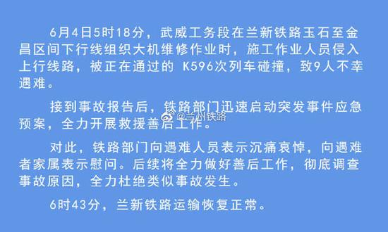據蘭州鐵路官方消息,6月4日,武威工務段在蘭新鐵路玉石至金昌區下行線組織大機維修作業時,施工作業人員侵入上行線路,被正在通過的K596次列車碰撞,致9人不幸遇難。