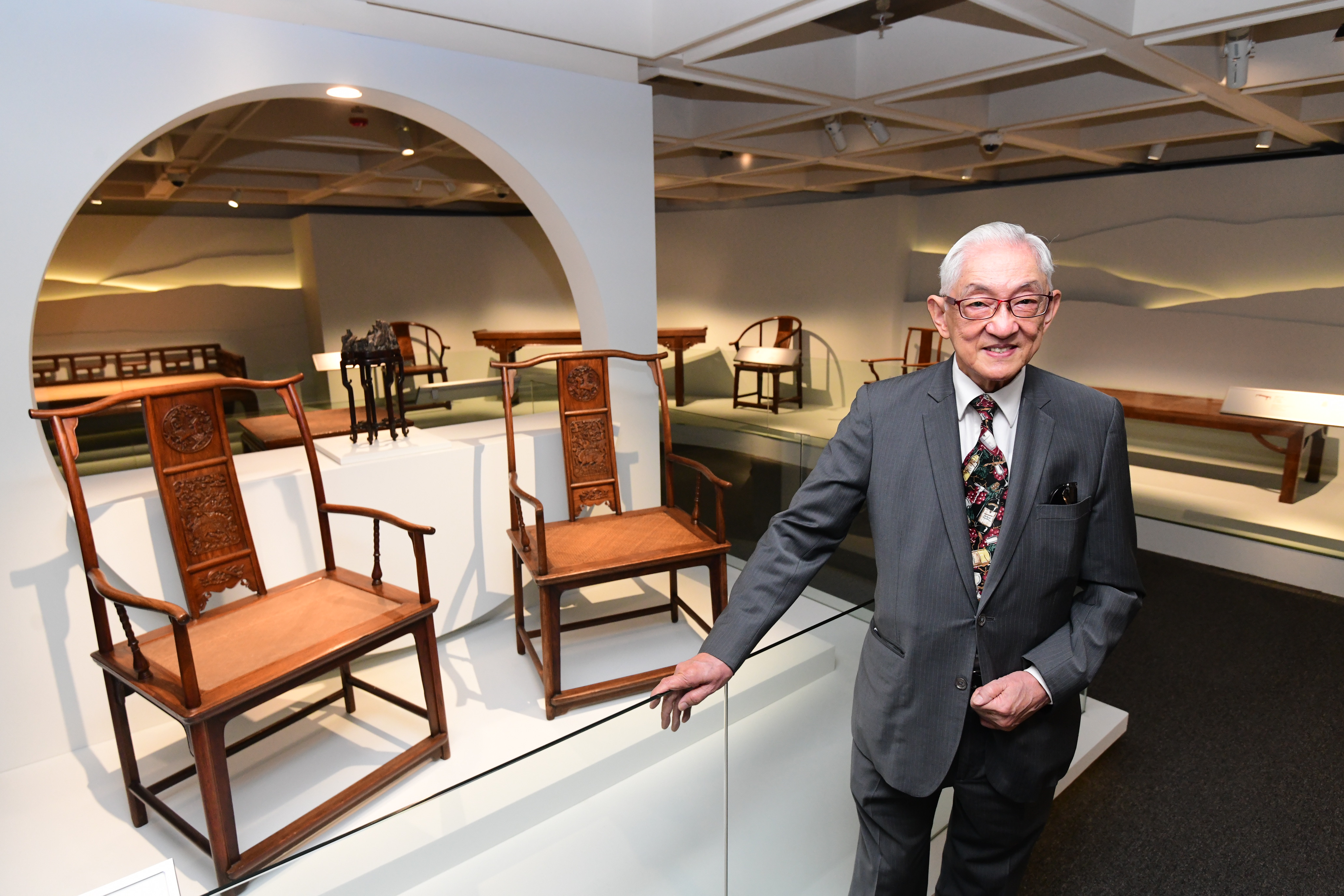 葉承耀及其藏品攢靠背四出頭官帽椅一對。此官帽椅雕刻華麗紋飾,有龍鳳及麒麟圖案,是珍罕御用品。
