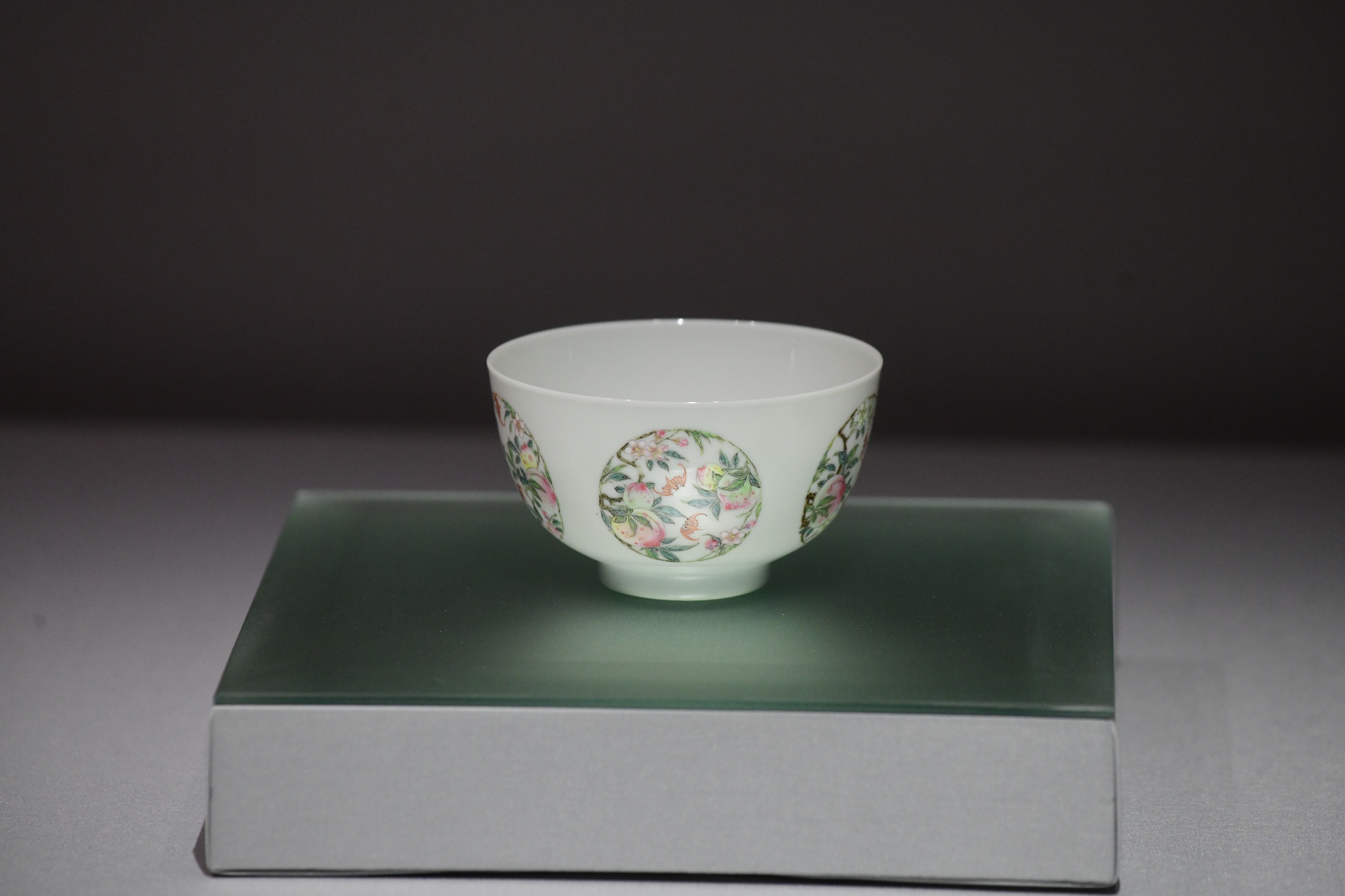 「粉彩福壽雙全團花紋碗」,清雍正(1723至1735年)。該碗目前是陳永達的藏品,據他介紹,之前曾被清朝一位在中國海關工作的洋人收藏。粉彩融入玻璃粉,讓顏色有深淺濃淡的漸變效果。