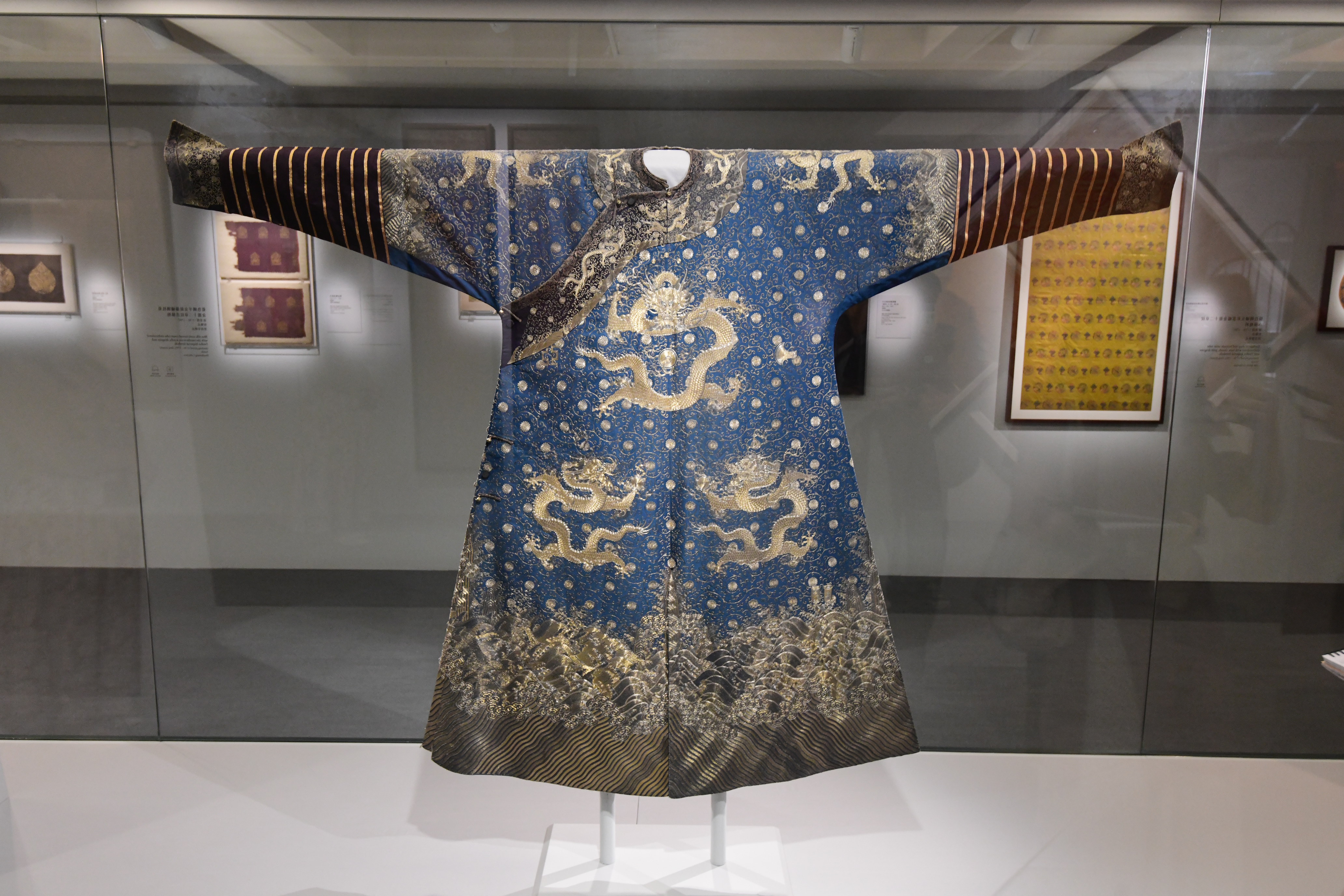 「藍色綢平金銀線繡纏枝菊金龍十二章紋吉服袍」,清乾隆(1736至1795年)。