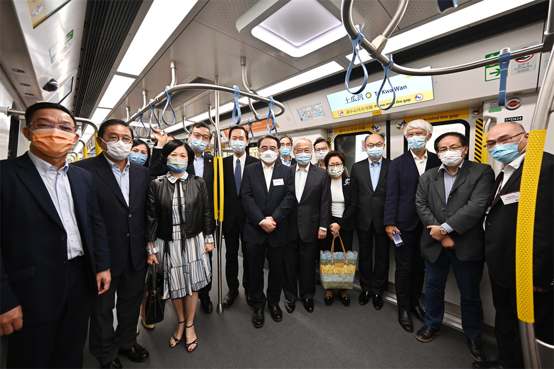 行會非官守議員召集人陳智思(左六)和行會非官守議員史美倫(右五)、周松崗(右七)、林健鋒(左二)、葉國謙(右二)、任志剛(右三)、葉劉淑儀(左四)、林正財醫生(左五)、劉業強(左一)、張國鈞(右六)與運輸及房屋局局長陳帆(右四)、運輸及房屋局常任秘書長(運輸)陳美寶(左三)、港鐵公司行政總裁金澤培博士(左七)、港鐵公司常務總監——車務及中國內地業務劉天成(右八)和港鐵公司車務總監李家潤博士(右一)在前往土瓜灣站的特別列車上合照
