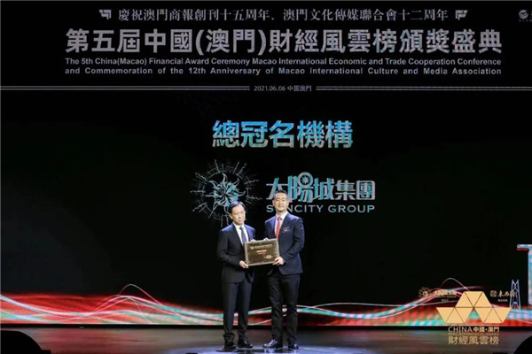 6月6日晚,由太陽城集團總冠名,東西匯(橫琴)發展有限公司贊助,澳門商報國際傳媒集團、澳門文化傳媒聯合會、永利關愛基金會主辦的第五屆中國(澳門)財經風雲榜頒獎盛典在澳門永利皇宮舉行。同場還舉行澳門商報創刊15周年暨澳門文化傳媒聯合會成立12周年答謝晚宴。