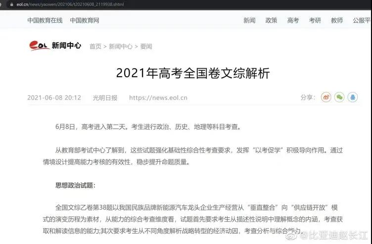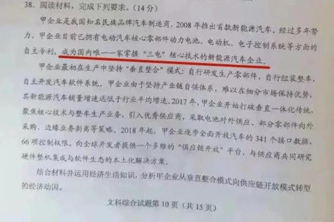 6月8日,全國高考文綜乙卷在第38題提到了「2008年推出首款新能源汽車」、「國內唯一一家掌握『三電』核心技術的新能源汽車企業」,有媒體猜測該企業為比亞迪。