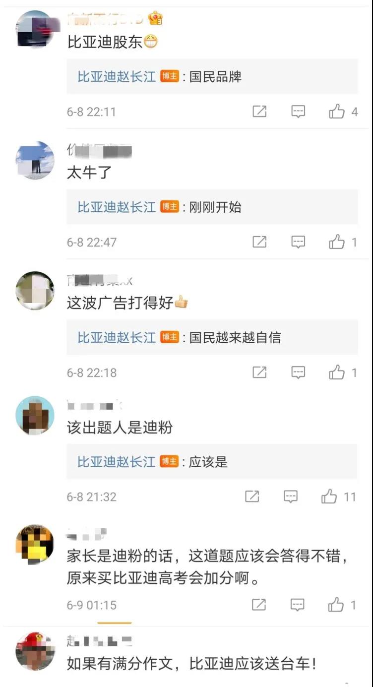 比亞迪品牌及公關事業部總經理李雲飛證實了這一點,並在其微博上發言稱:「比亞迪又成為今年的高考命題了!14分!要考高分,得是迪粉啊!」