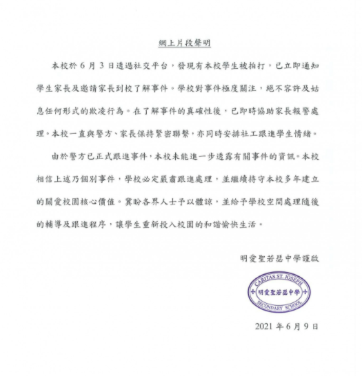 青衣明愛聖若瑟中學發生校園欺淩事件。網上流傳影片顯示,一名有特殊學習需要的男學生在課室內被兩名女同學掌摑,該男生一度雙手合十跪地求饒。