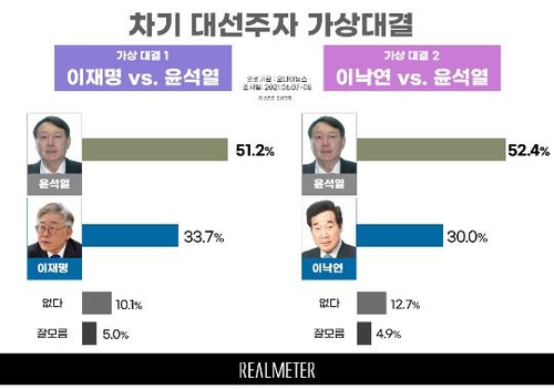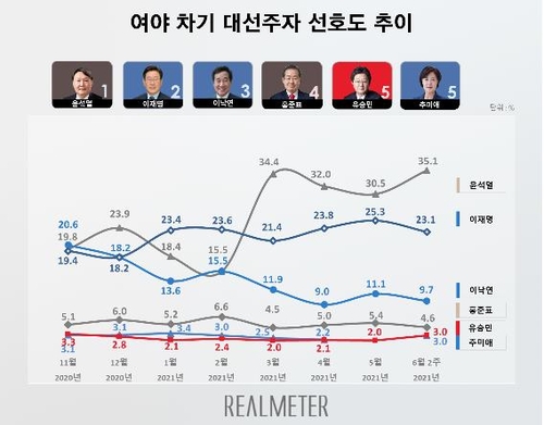 Realmeter受網媒OhmyNews委託于7日至8日面向全國18歲以上的2013人進行了下屆大選熱門人選的支持率調查。結果顯示,尹錫悅以35.1%穩居首位,結束了支持率連續兩個月下滑的局面。現京畿道道知事李在明的支持率23.1%,較兩周前下滑2.4個百分點。其後依次為共同民主党前党首李洛淵(9.7%)、無党籍議員洪准杓(4.6%)、前法務部長官秋美愛(3%)、國民之党党首安哲秀(2.8%)、前國務總理丁世均和首爾市長吳世勳(各2.6%)。