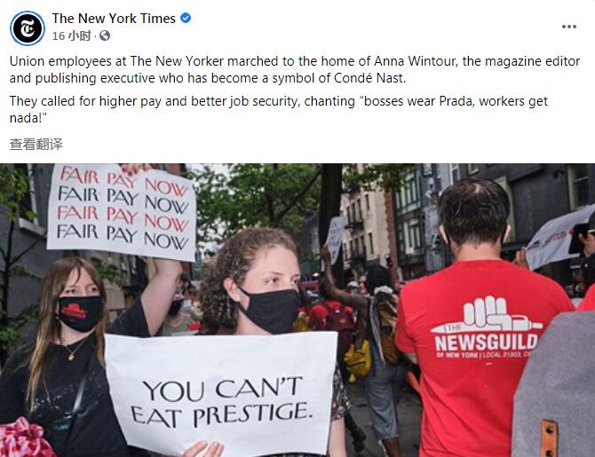 美國老牌文化雜誌《紐約客》(The New Yorker)頗負盛名,工會成員卻不滿長年薪資待遇過低,近期公開抗議:「老闆穿Prada,員工吃土」。