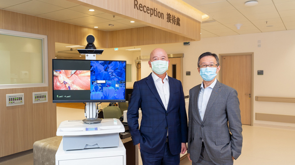 香港電訊商業客戶業務董事總經理陳紀新先生(左)與香港中文大學醫院行政總裁馮康醫生一同於5G智慧醫院展示嶄新設施。