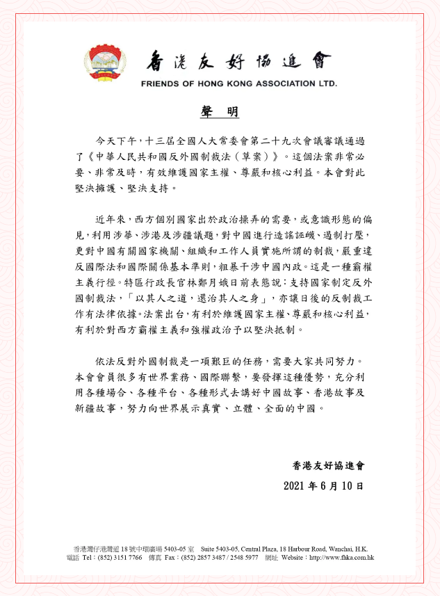 聲明引述行政長官林鄭月娥日前表態說:支持國家制定反外國制裁法,「以其人之道,還治其人之身」,亦讓日後的反制裁工作有法律依據。法案出台,有利於維護國家主權、尊嚴和核心利益,有利於對西方霸權主義和強權政治予以堅決抵制。