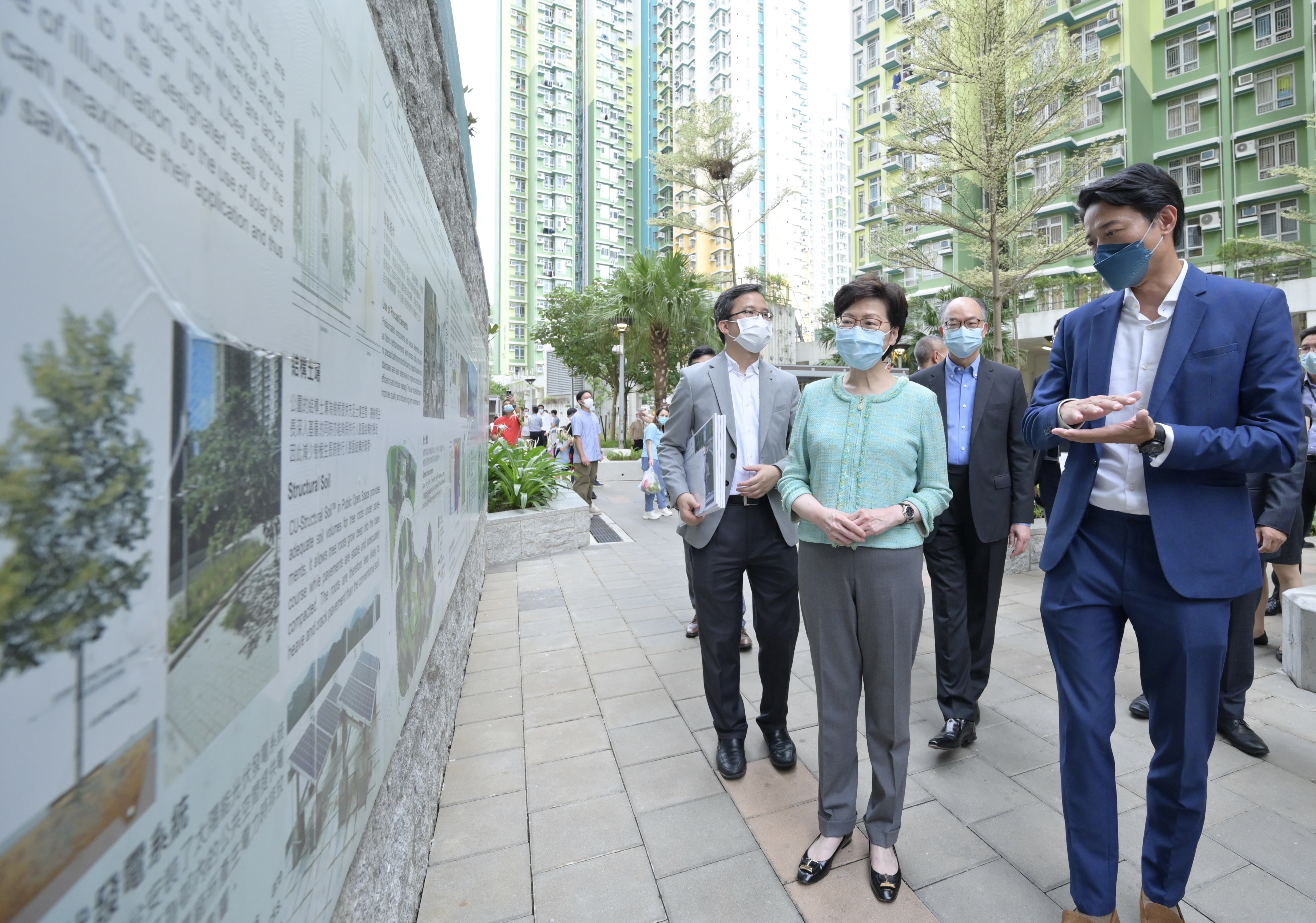 圖示林鄭月娥聽取房屋署人員介紹設置於安泰邨岩山公園旁的展板