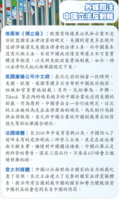 意大利媒體:中國以往面對西方國家的合力制裁吃盡了苦頭,本次立法建立了完整的國家法律震懾體系,提示所有企圖制裁中國的國家和勢力膽敢損害中國利益就會受到來自中國的懲罰。