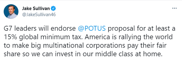據路透社報道,美國國家安全顧問蘇利文周五發表推文稱,在英國舉行峰會的七國集團領導人將支持美國總統拜登提出的設定15%全球最低企業稅率的提議。