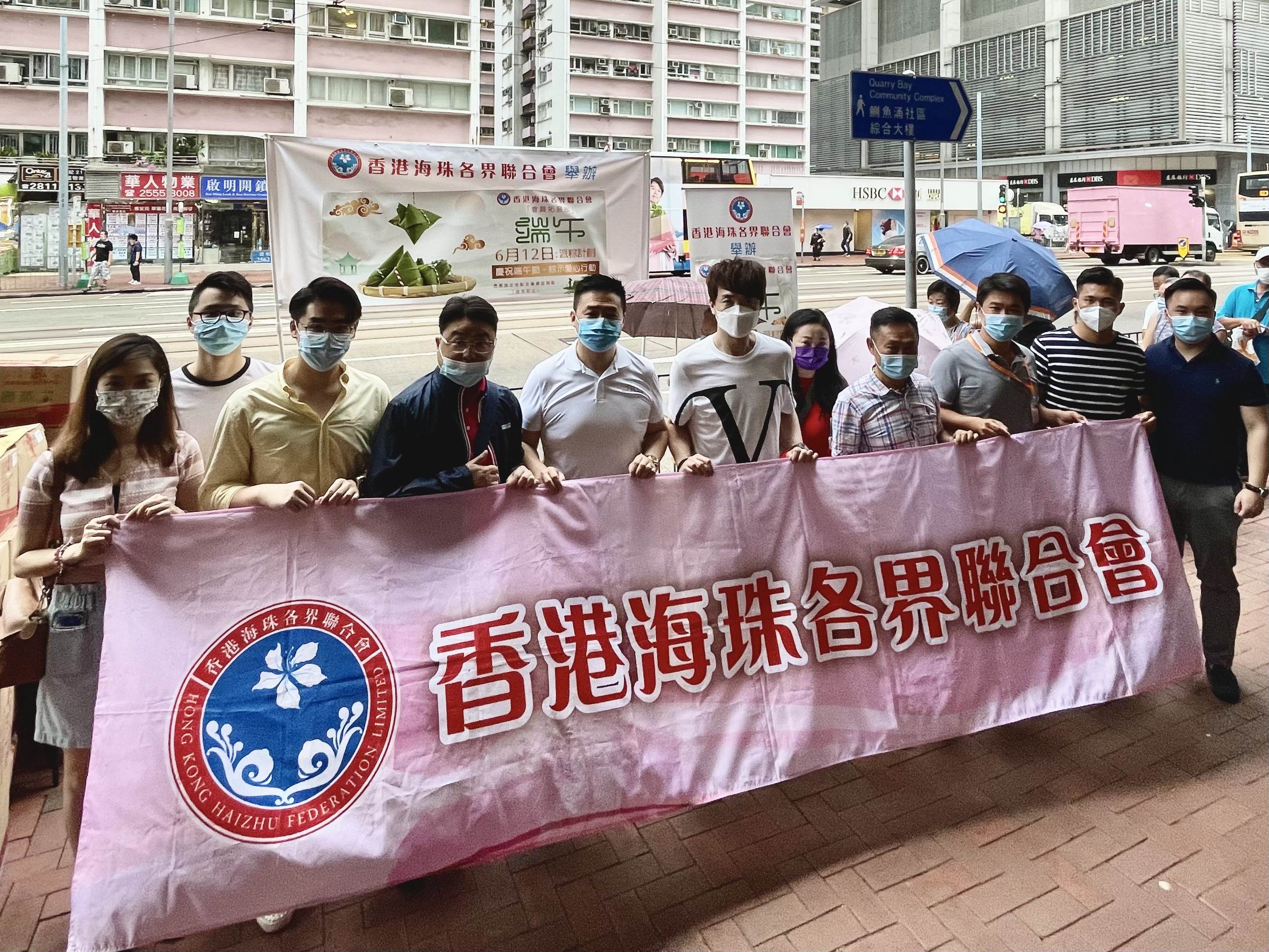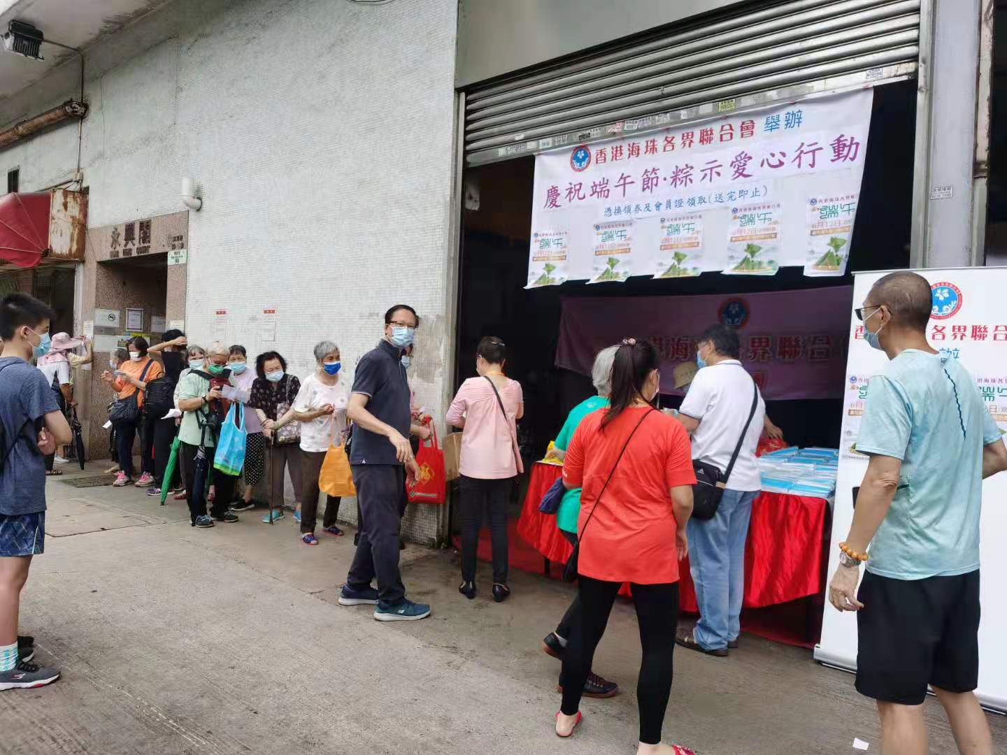 香港海珠各界聯合會12日在東區舉辦「粽示愛心」社區關愛活動,藉端午節來臨之際向市民獻出關心。活動分上下午兩個時段派發糉子,逾兩千多人受益。當日一度下起傾盆大雨,卻擋不住會員及街坊們的熱情,其樂融融的氛圍讓在場眾人體會到濃濃心意。