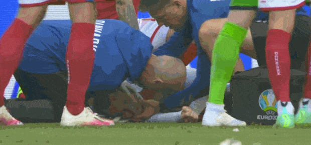 第42分鐘,丹麥當家球星埃里克森在非對抗情況下突然暈厥倒地,隊醫迅速進場處理,從比賽鏡頭來看,埃里克森已經完全失去意識,丹麥球員將埃里克森圍了起來,德萊尼甚至已經哭了,球迷也在現場濕潤了雙眼。隊醫依然在對埃里克森進行搶救。
