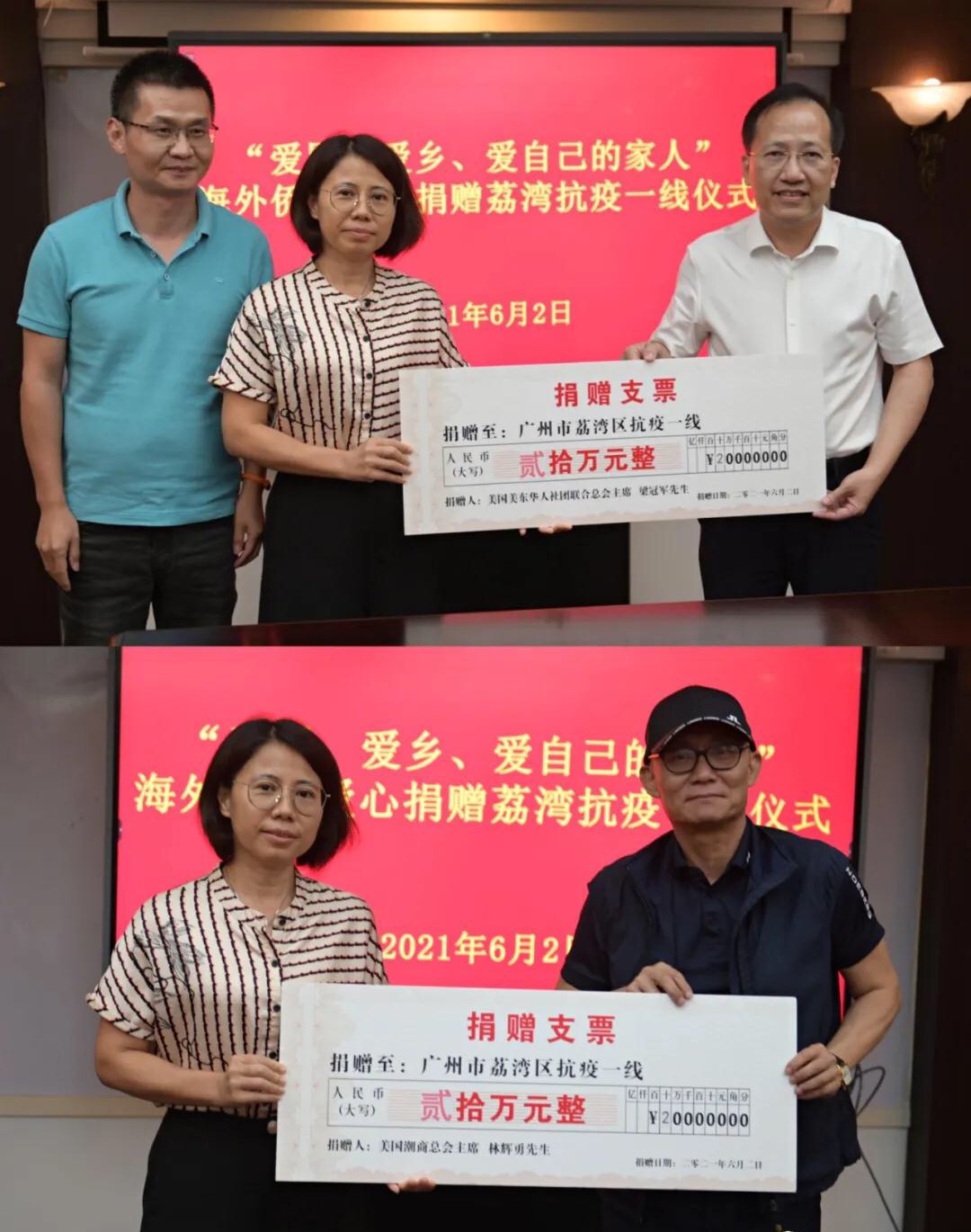 據悉,美國美東華人社團聯合總會主席梁冠軍先生、美國潮商總會主席林輝勇先生各向荔灣區抗疫一線捐贈20萬元人民幣用於購置目前急需防疫物資。梁冠軍、林輝勇表示:“去年以來,全球暴發新冠肺炎疫情,在海外僑胞最困難的時刻,祖國的親人及時給我們寄來了防疫物資,為我們提供防疫指引,體現祖國人民與海外僑胞血濃於水的骨肉親情,此次廣州發生新冠肺炎疫情,牽動著每一位海外僑胞的心,我們希望通過微薄的捐贈為奮戰在抗疫一線的工作人員提供支持,為抗擊疫情盡綿薄之力,表達與祖國同呼吸、共命運的赤子情懷。”