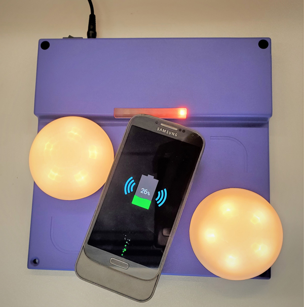 應科院供智能家居和辦公室使用的共振式無線充電器(紫色底座),可同時為手機、手提電腦、燈泡等充電。