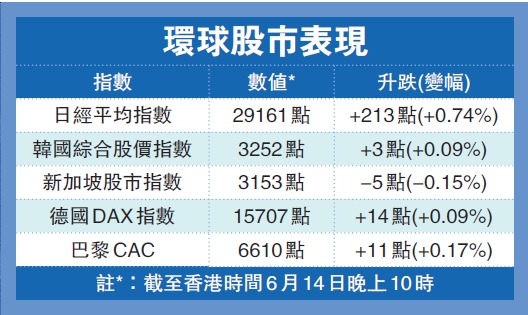 另外,中央政府本周三將公布內地5月「三頭馬車」經濟數據,即規模以上工業增加值、固定資產投資,以及零售銷售數據;本周四則公布5月內地70個大中城市樓價表現。兩項數據料左右A股及港股走勢。