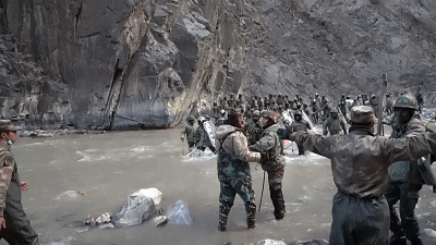 加勒萬河谷,蓄謀已久的大批敵軍仗着長棍與盾牌蹚水越線,祁發寶團長帶着寥寥數人前出談判,他伸開雙臂阻擋敵軍的畫面,銘刻史冊。
