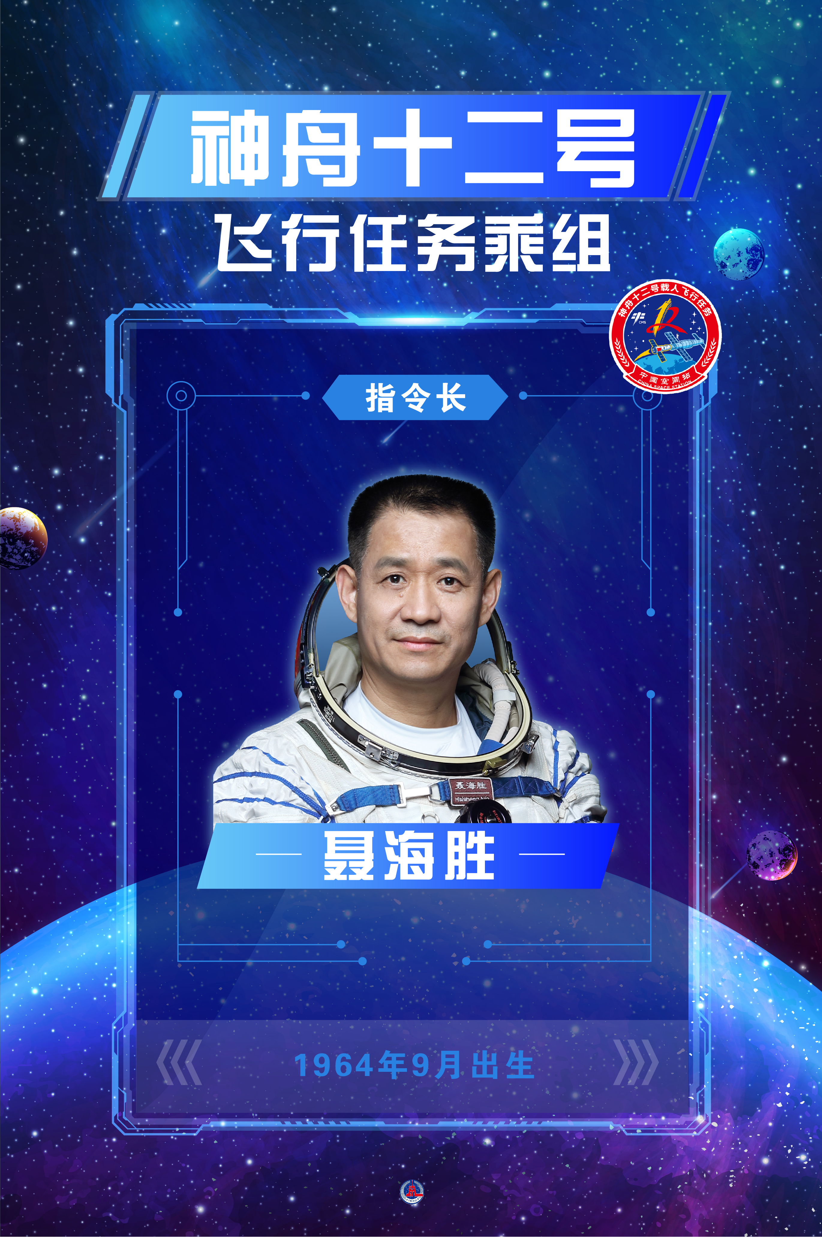 聶海勝,男,漢族,籍貫湖北棗陽,中共黨員,博士學位。1964年9月出生,1983年6月入伍,1986年12月加入中國共產黨,2014年6月任中國人民解放軍航天員大隊大隊長,現為航天員大隊特級航天員,專業技術少將軍銜。曾任空軍航空兵某師某團司令部領航主任,安全飛行1480小時,被評為空軍一級飛行員。1998年1月入選為我國首批航天員。2003年9月,入選神舟五號飛行任務備份航天員。2005年10月,執行神舟六號飛行任務,同年11月被中共中央、國務院、中央軍委授予「英雄航天員」榮譽稱號,並獲「航天功勳獎章」。2008年5月,入選神舟七號飛行任務備份航天員。2012年3月,入選神舟九號飛行任務備份航天員。2013年6月,執行神舟十號飛行任務,擔任指令長,同年7月,被中共中央、國務院、中央軍委授予「二級航天功勳獎章」。2019年12月入選神舟十二號飛行任務乘組,擔任指令長。