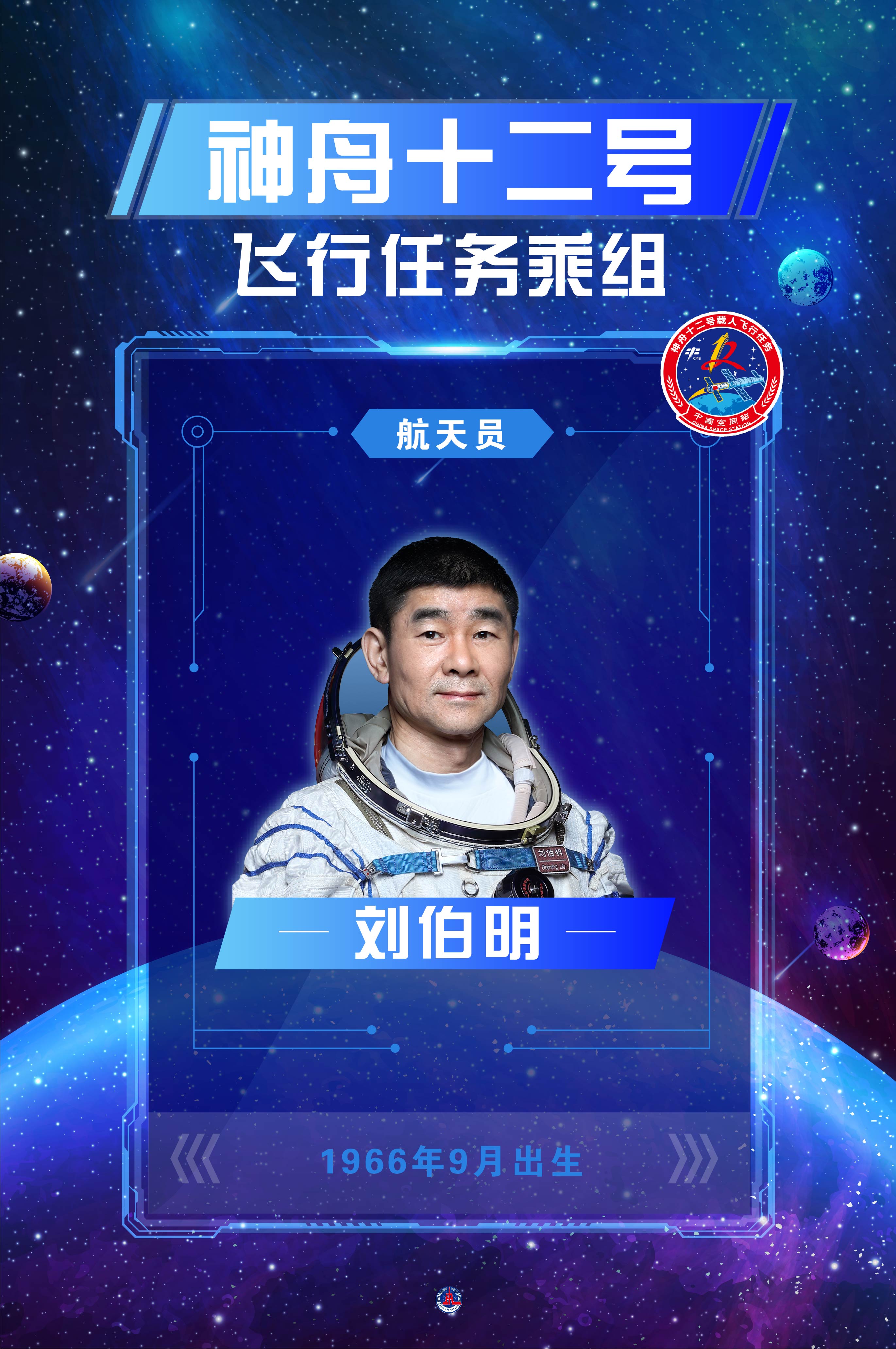 劉伯明,男,漢族,籍貫黑龍江依安,中共黨員,碩士學位。1966年9月出生,1985年6月入伍,1990年9月加入中國共產黨,現為中國人民解放軍航天員大隊特級航天員,少將軍銜。曾任空軍航空兵某師某團中隊長,安全飛行1050小時,被評為空軍一級飛行員。1998年1月入選為我國首批航天員。2005年6月,入選神舟六號飛行任務備份乘組。2008年9月,執行神舟七號飛行任務,同年11月,被中共中央、國務院、中央軍委授予「英雄航天員」榮譽稱號,並獲「航天功勳獎章」。2019年12月入選神舟十二號飛行任務乘組。