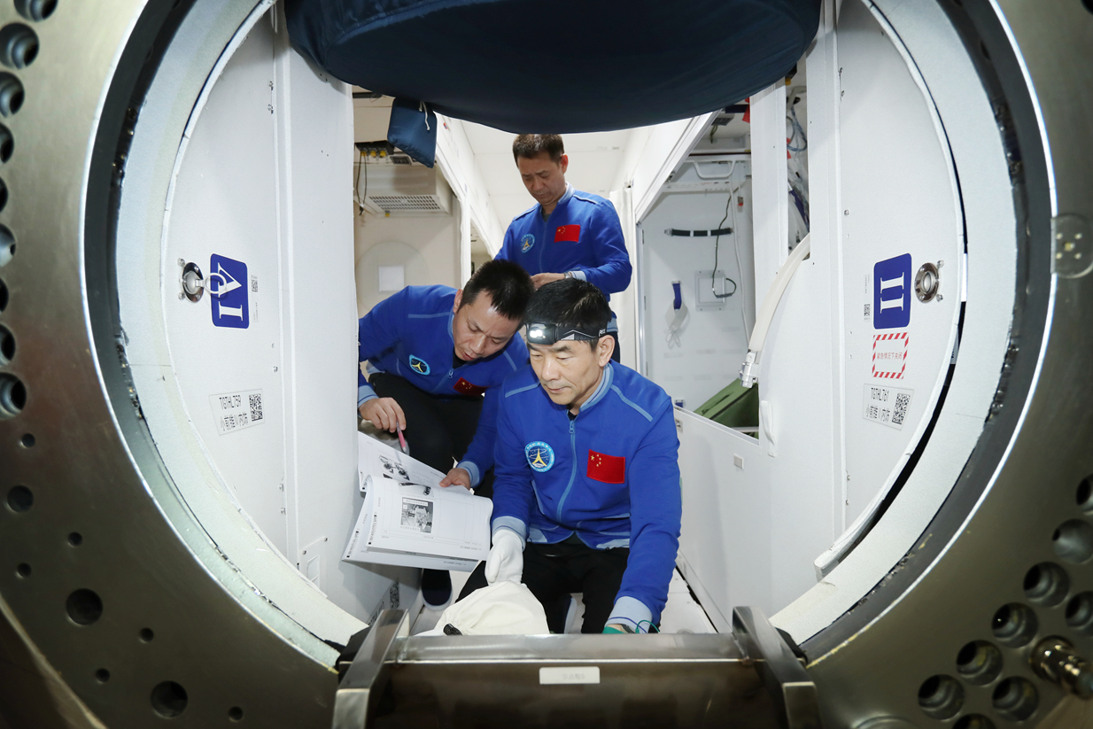 睡眠方面,艙內雖然依然要「裝進睡袋」睡覺,但已實現了從「站睡」到「躺睡」的技術變革。此外,相對獨立的睡眠區設計,能讓太空人享受相對高質量的睡眠;衛生方面,每位太空人都能在「包裹式淋浴間」裏,手持噴槍,把自己擦拭乾淨,最大程度解決個人衛生問題;就餐區配置了食品加熱、冷藏及飲水設備,還有折疊桌,方便航天員就餐;鍛煉區配備有太空跑台、太空自行車,用於太空人日常鍛煉。