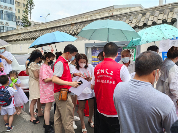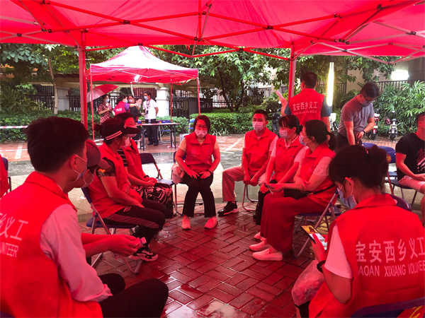 據悉,了解到「一線人員告急」情況後,西鄉街道團工委、義工聯立刻建立了西鄉街道防疫應急志願者微信群,通過朋友圈、微信群召集志願者,隨着新的群友不斷的加入,微信群滿了一個又一個,截止6月16日已有1000人左右自願加入。「我們在群里發布志願者召集信息,馬上就會有熱心的志願者,緊接着就有一個又一個志願者接龍」,西鄉街道團工委工作人員告訴記者:「西鄉街道有280多個點位,每個點位配備3個志願者,我們發布完信息不到一個小時,各個點位的志願者就都滿員了」。這些志願者分別前往西鄉各個社區支援,奮鬥在抗疫一線,他們頂著高溫,每天奮戰十餘小時,耐心為前來做核酸檢測的群眾提供秩序維護、掃碼登記、測量體溫、信息收集等服務,有效解決了社區人流量大、人手不足的問題,大大推進了社區疫情防控工作進度。