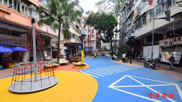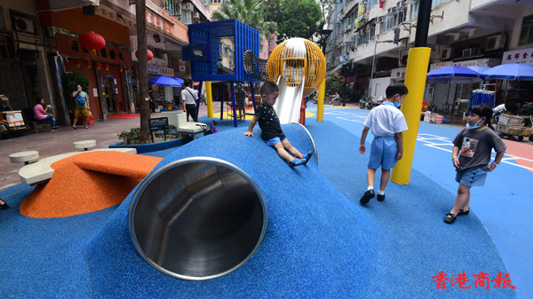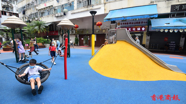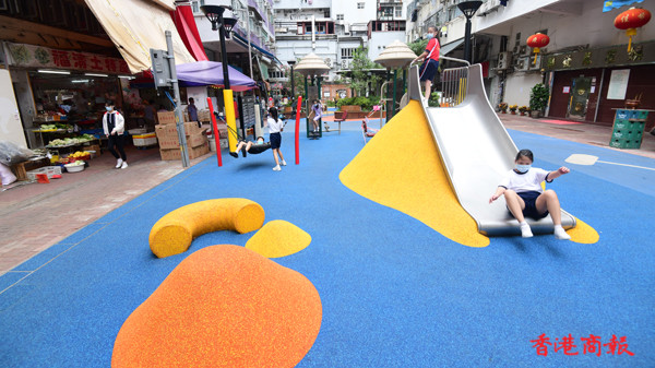 遊樂場內增設了長者健體設施,另有多款適合三至五歲小童遊玩的共融兒童遊樂設施,如高低不平的小斜坡、小山洞,令人感覺本是平平無奇的公園,瞬間變成開心小樂園。遊樂場設有三個區域,又有跳飛機、車軚韆鞦、滑梯、小型氹氹轉繩網等,另設水磨石座位,一改過往舊貌,確是老少咸宜的休憩地。(崔俊良攝)