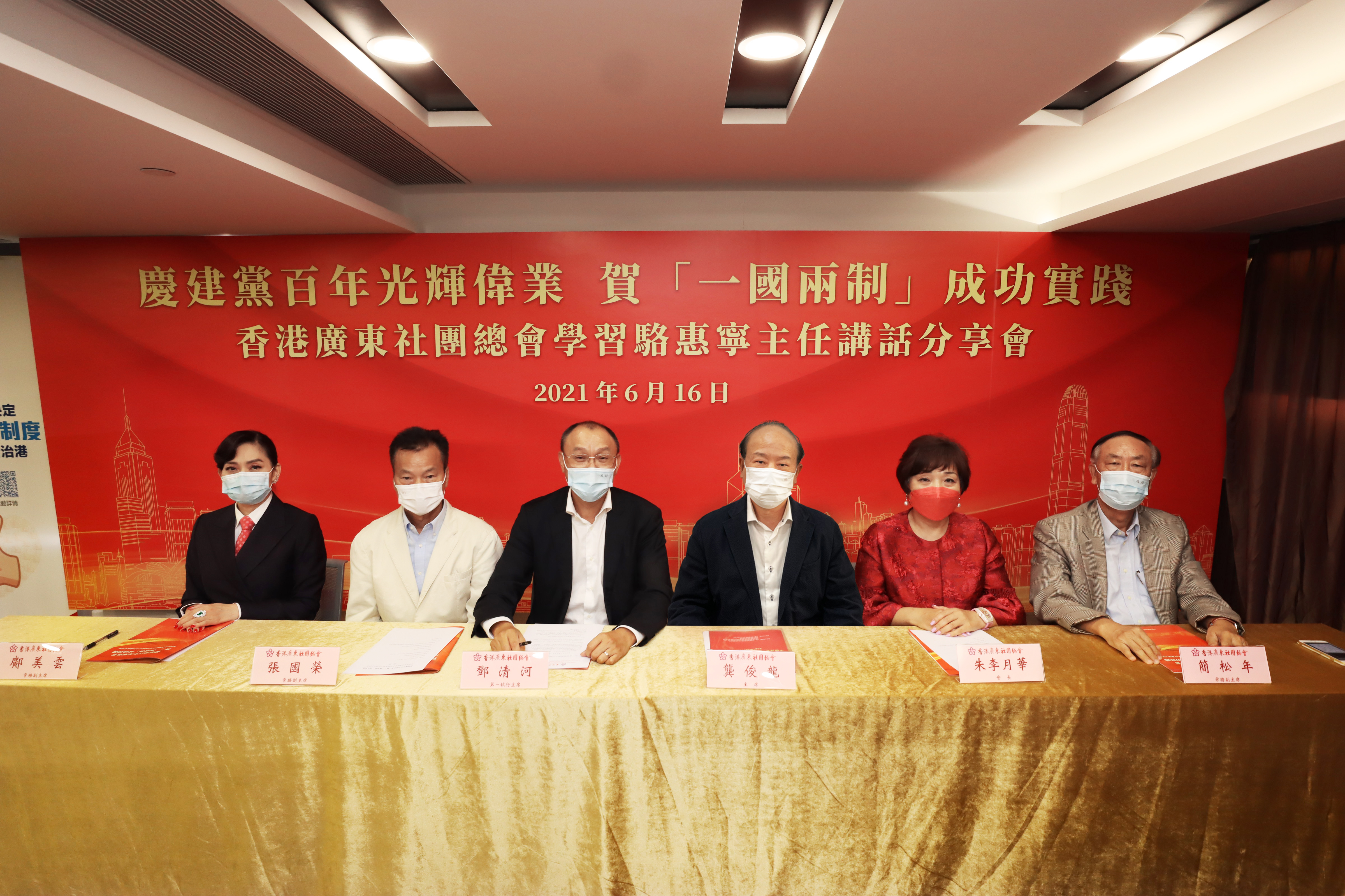 香港廣東社團總會於6月16日假會所舉行「慶建黨百年光輝偉業 賀『一國兩制』成功實踐」學習分享會。為深入理解和認真領會中聯辦主任駱惠寧在「中國共產黨與『一國兩制』主題論壇」的重要講話精神,該會近200名首長會員線上線下聆聽講座,並發表心得體會。該會主席龔俊龍講到,維護中國共產黨的領導就是維護「一國兩制」,就是維護香港的光明前途和香港同胞的根本福祉。