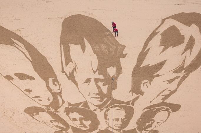 當地時間6月10日,在英國的水門灣海灘,樂施會活動人士團體Avaaz創作了一幅巨大的沙灘沙畫,上面描繪了G7領導人的肖像,並在沙子上書寫「分享疫苗,放棄專利」等字樣。