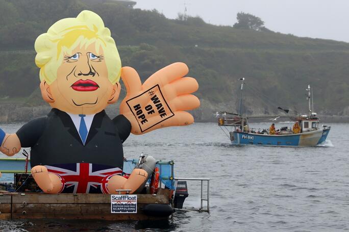 當地時間6月11日,在英國康沃爾郡,一個英國首相約翰遜的充氣假人在浮橋上展出。