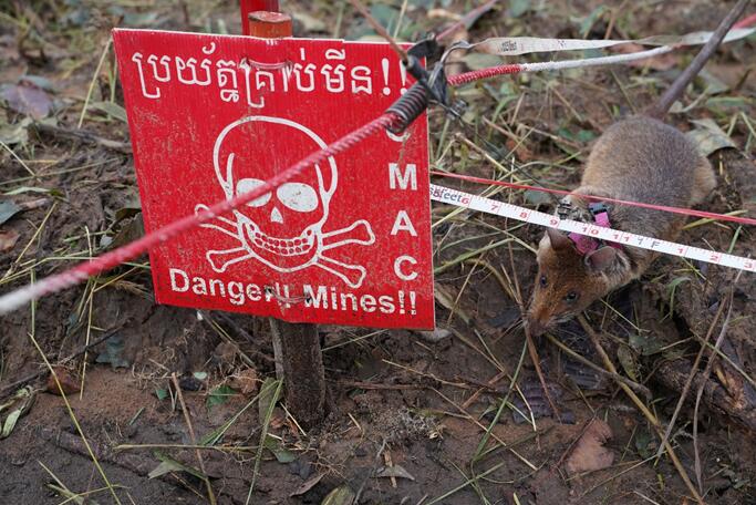 當地時間6月11日,在柬埔寨的柏威夏省,一隻掃雷鼠正在進行排雷工作。