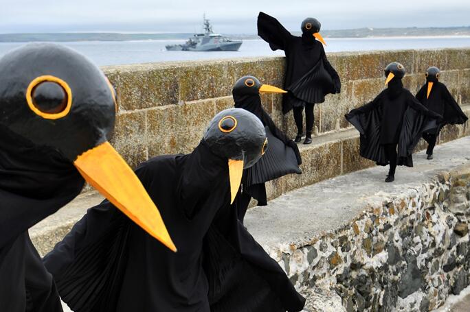 當地時間6月11日,在英國康沃爾郡,G7峰會期間,關注氣候變化的活動家打扮成黑鳥進行抗議。