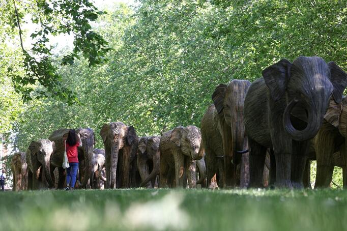 當地時間6月14日,在英國倫敦的綠園,人們在參觀園內的數尊 1:1大象雕塑。這些雕塑是「大象家族信託」特地為一個名為「共存」的活動而準備的展品。