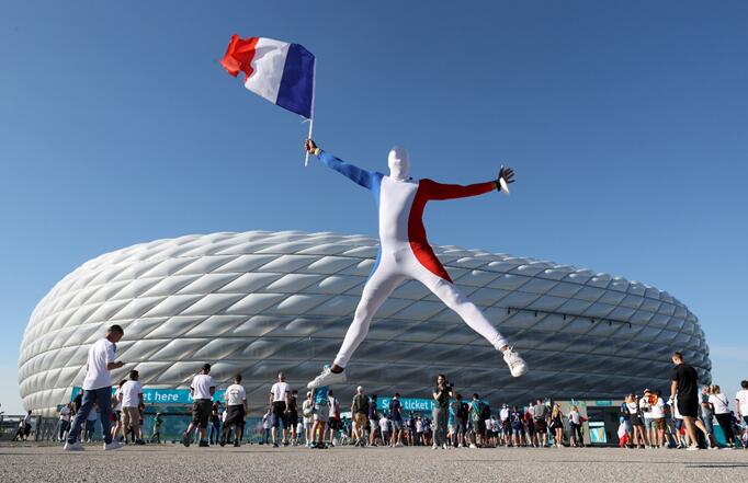 當地時間6月15日,在德國慕尼黑,在一場德法之間的比賽開始前,一名法國球迷在體育場外躍起。