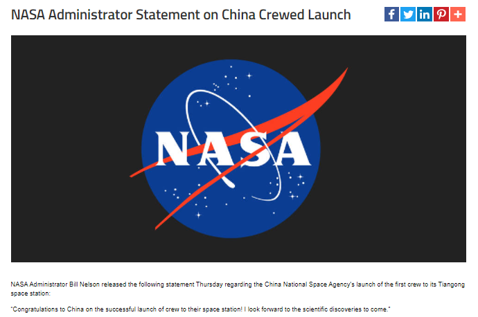 NASA署長納爾遜在NASA官網發表聲明稱,祝賀中國太空人成功進入太空站,期待著未來的科學發現。