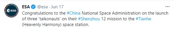 歐洲航天局在其官方推特發文稱,祝賀中國國家航天局發射神舟十二號載人飛船,將三名太空人送入天和核心艙。