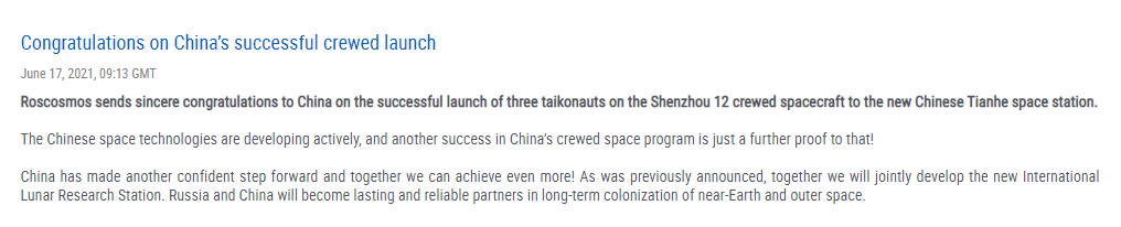 俄羅斯聯邦航天局在其官網上發布了祝賀中國神舟十二號載人飛船發射成功的賀電,對中國國家航天局向中國太空站成功發射攜帶三名太空人的神舟十二號載人飛船表示祝賀。賀電中還表示,中國航天技術發展迅速,此次成功發射再一次證明中國載人航天項目的又一次成功。中國向前邁出了自信的一步,希望中俄兩國能共同合作取得成績。(圖源:路透社)
