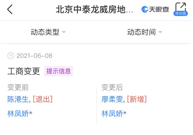 天眼查App顯示,近日,北京中泰龍威房地產諮詢有限公司、藝房紫(北京)文化傳播有限公司接連發生工商變更,陳港生(成龍)退出,新增廖柔雯;兩家公司均成立於2007年2月。
