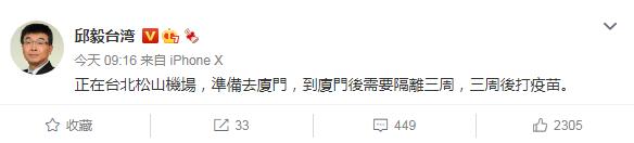 台灣地區政治人物,台灣大學經濟學博士邱毅21日在其個人微博上宣布,他正在台北松山機場,準備去廈門接種大陸的新冠疫苗。邱毅這則微博發文四個小時就得到超過1,500名網友點讚,不少大陸網友還對邱毅到大陸打疫苗表示歡迎。