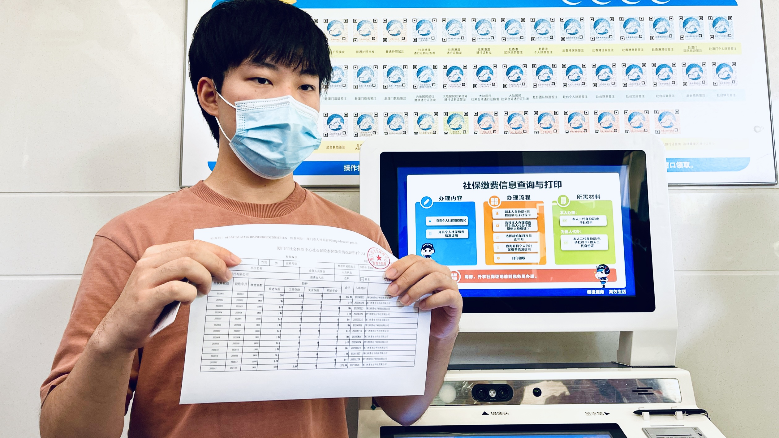 目前,「e政務」還可以為境外人員在廈工作、生活提供更多便利。如子女就學時,境外人員可以就近在「e政務」便民服務站打印領取社保繳費證明,作為在廈工作的憑證;此外,港澳台同胞也可以憑社保繳費證明,在廈接種新冠病毒疫苗。現場,在廈門工作的香港人朱先生通過「e政務」辦理社保繳費證明打印,用時不到5分鐘。