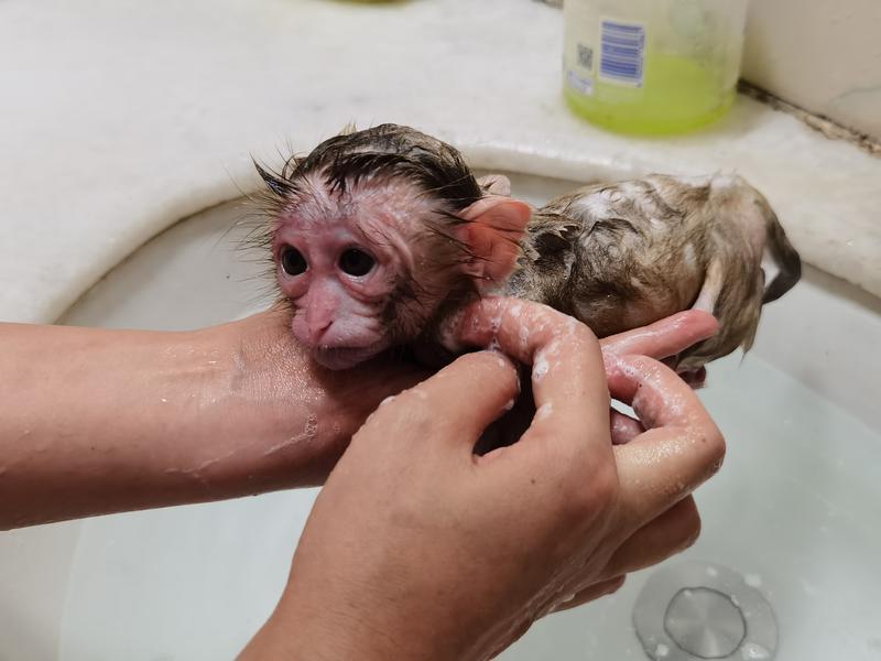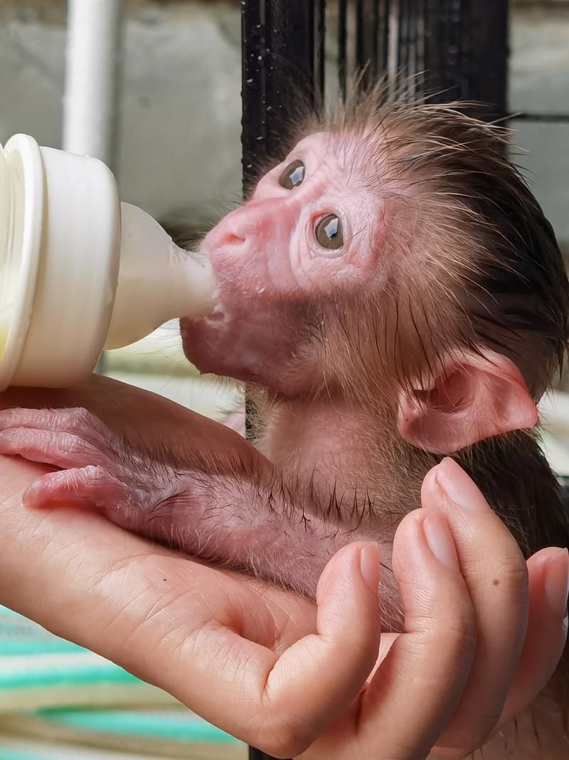 因直到天黑都沒有母猴來照顧小猴,管理站工作人員便將小猴帶回了站里照顧,對體表傷痕進行消毒處理,用羊奶粉進行餵養。