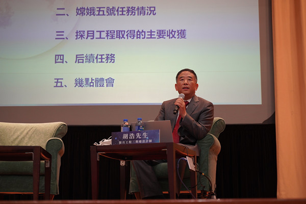 胡浩詳細介紹了在嫦娥五號工程。他介紹月球採樣的工作情況,表示取樣分為表取(月球表面抓取一部分月壤)和鑽取(鑽到月表以下把月壤整體取出來)兩種方式。他特意提及香港理工大學研製的表取採樣設備、相機、封裝裝置等;鑽取設備則是哈爾濱工業大學研製提供。他還透露,鑽取原定要鑽兩米左右,實際由於遇到岩層,最終只鑽了一米。