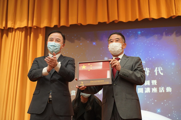 探月工程三期總設計師胡浩向港大贈送國旗。羅璇 攝