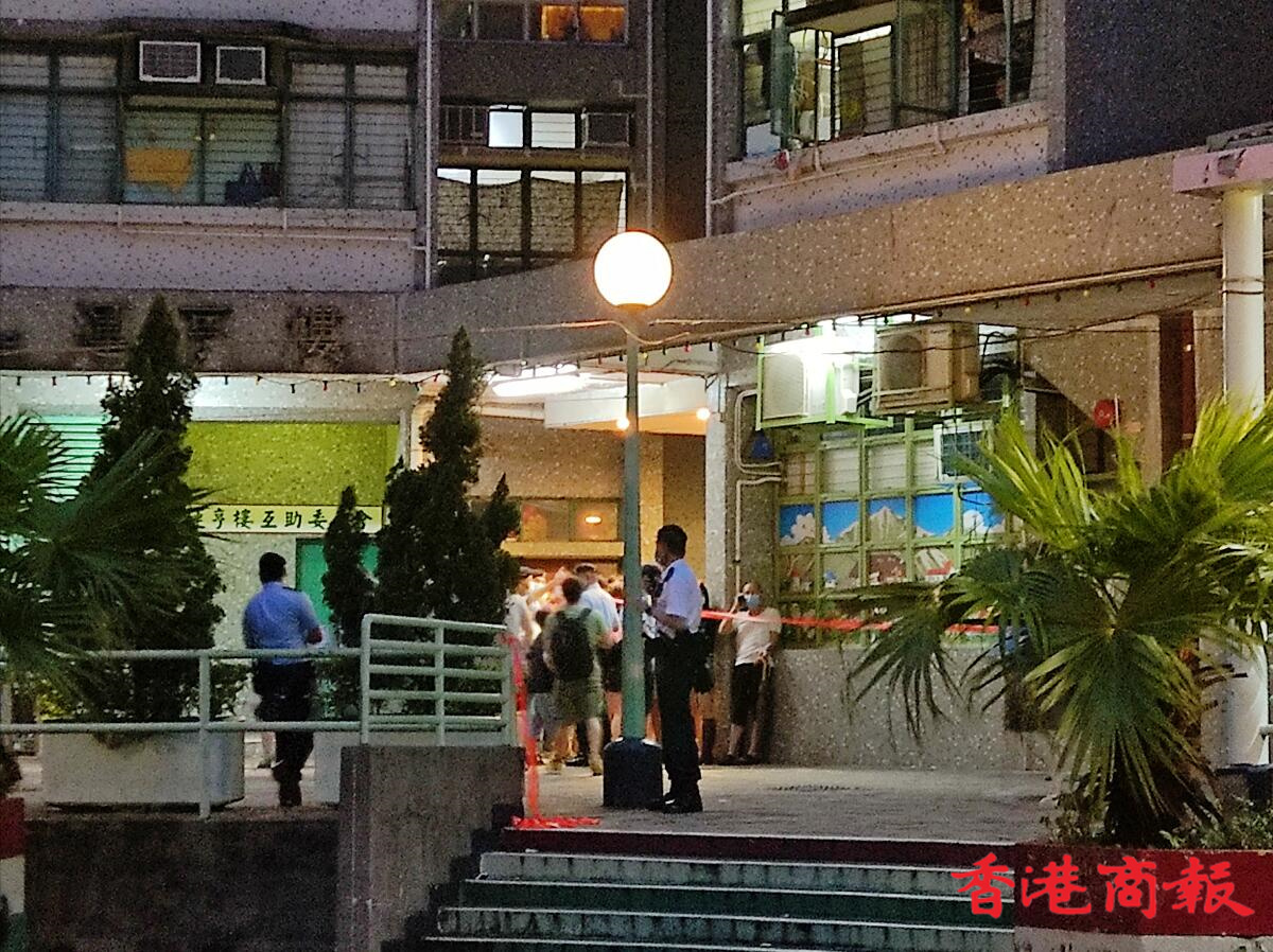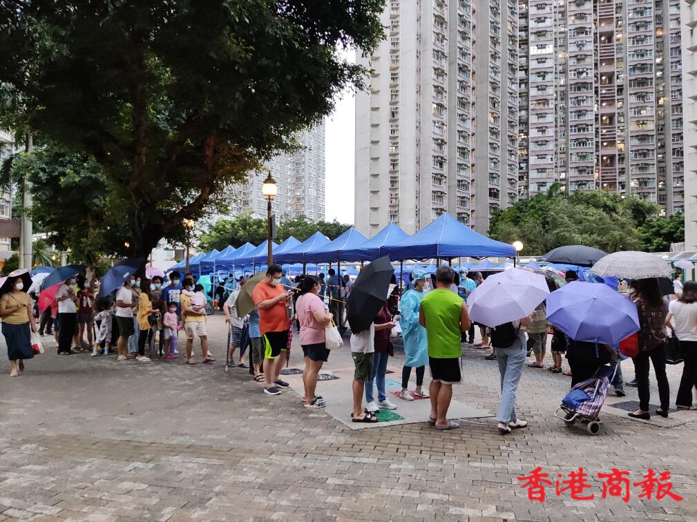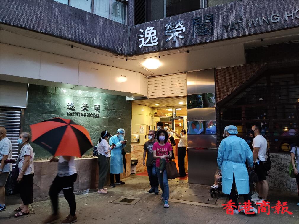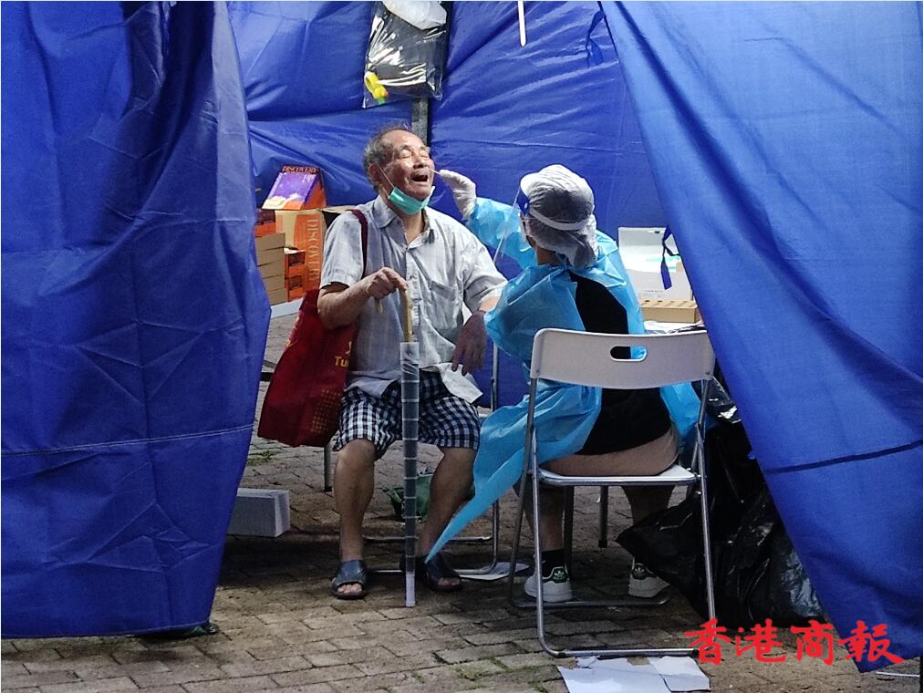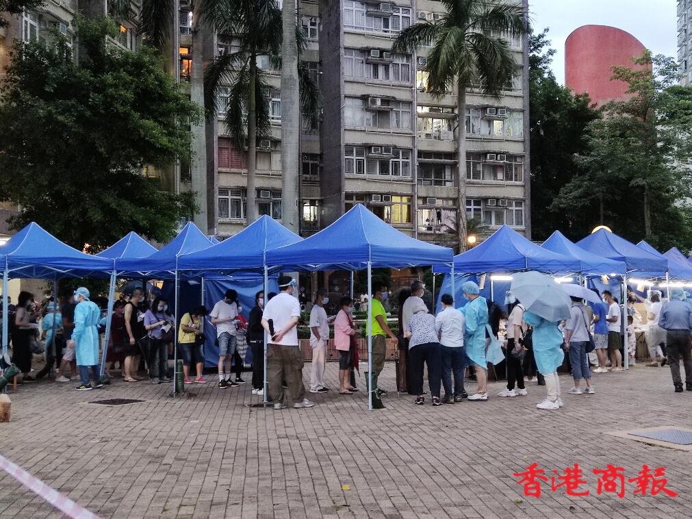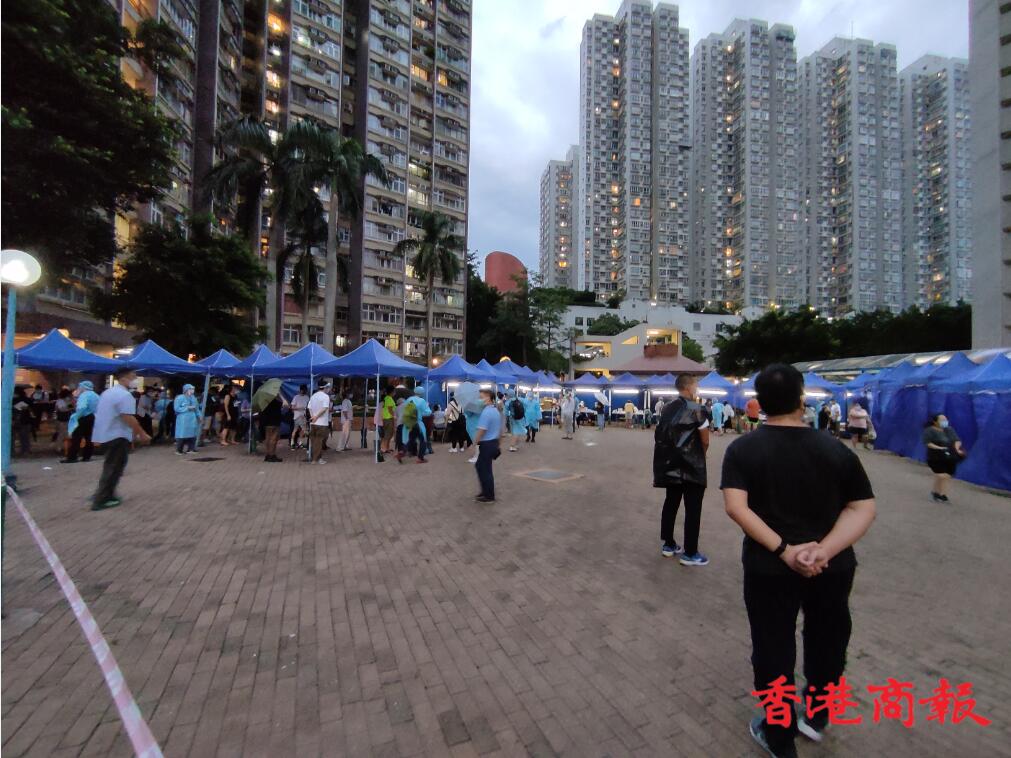 政府在逸雅苑A座(逸榮閣)對出空地有流動採樣站,大批市民到來進行檢測。(馮瀚文攝)