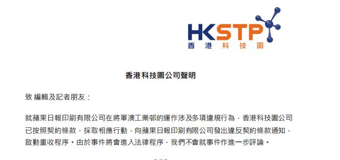科技園23日晚間發聲明指,就蘋果日報印刷有限公司在將軍澳工業邨的運作涉及多項違規行為,科技園已按照契約條款,採取相應行動,向蘋果日報印刷有限公司發出違反契約條款通知,啟動重收程序。