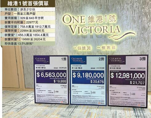 中國海外(688)旗下九龍東啟德維港1號昨日公布首批價單,推出212伙單位,單位戶型包括一至三房,實用面積介乎329至643平方呎,呎價介乎22994至30295元,售價介乎758.8萬元至1912.7萬元。計及發展商最高13.5%的折扣優惠,折實呎價介乎19888元至26204元,折實售價656.3萬元至1654.4萬元。維港1號為跑道區第一個開賣的住宅項目。