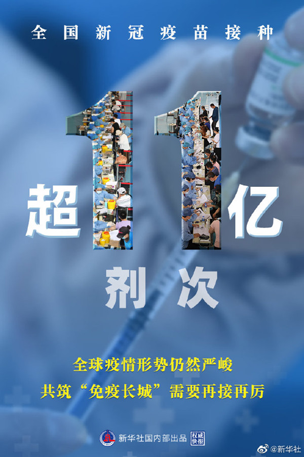 國家衛健委6月25日通報,全國新冠疫苗接種超11億劑次。全球疫情形勢仍然嚴峻,共築「免疫長城」,需要再接再厲。