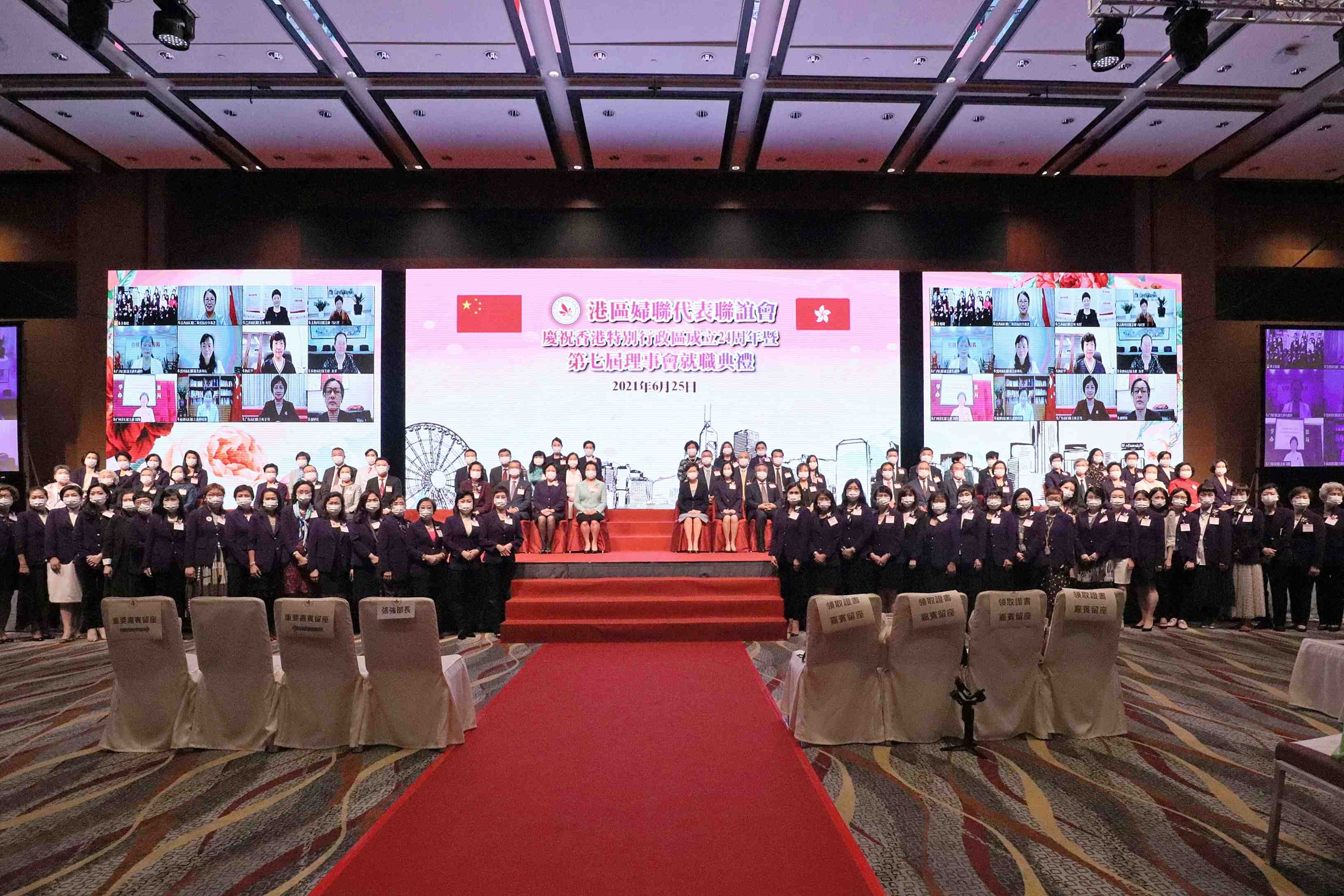 港區婦聯代表聯誼會「慶祝香港特別行政區成立24周年暨第七屆理事會就職典禮」假灣仔會展中心舉行,線上線下賓主大合照。